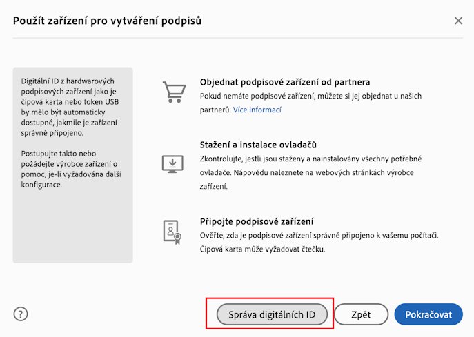Poté zvolte první možnost Použít zařízení pro vytváření podpisu a klikněte na Pokračovat