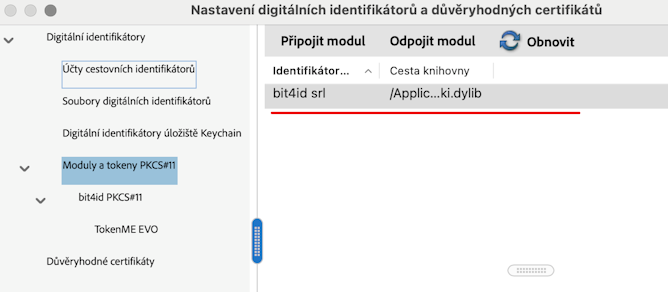 6. Ověřte, že modul bit4id PKCS#11 byl vytvořen a poté ukončete aplikaci Adobe